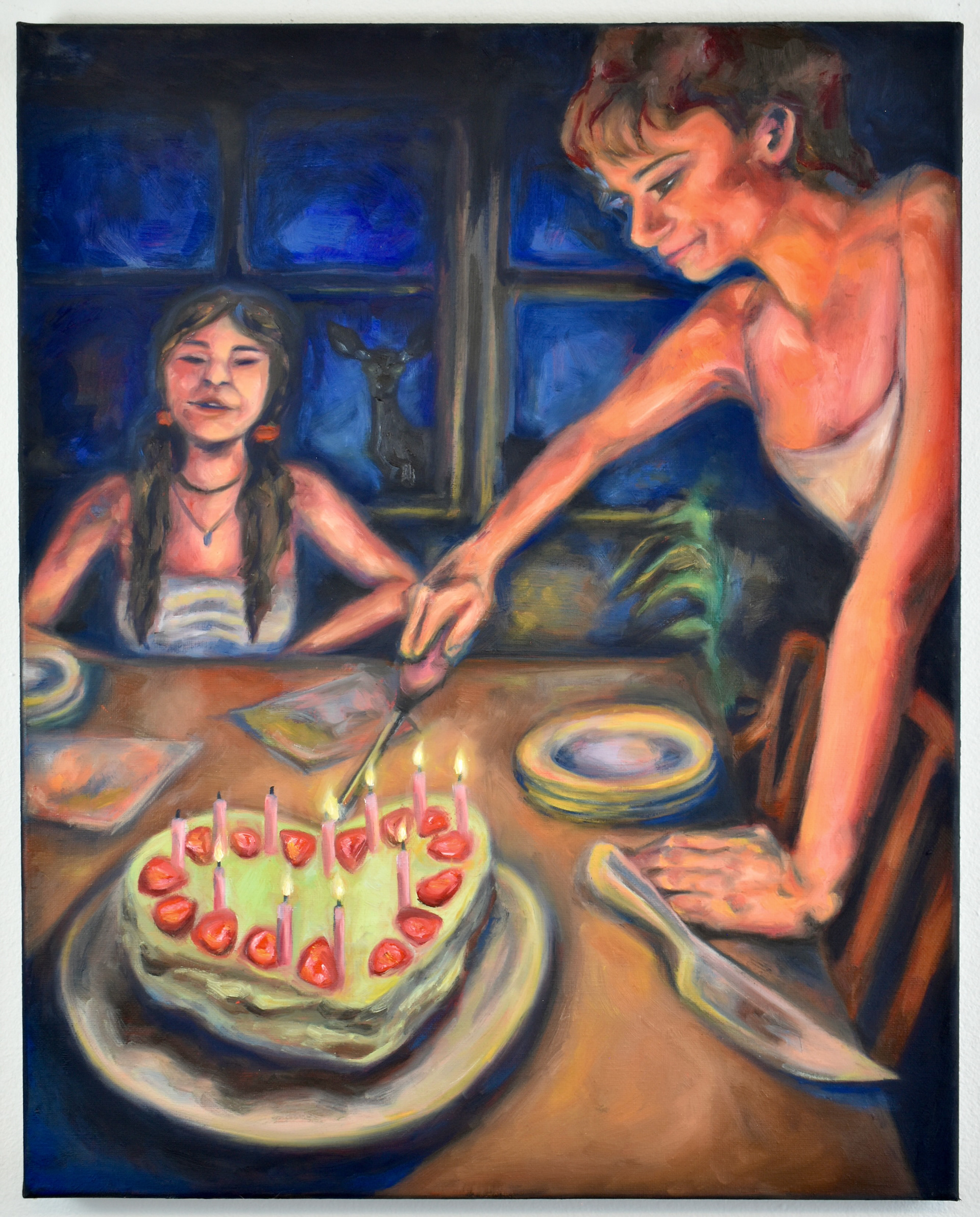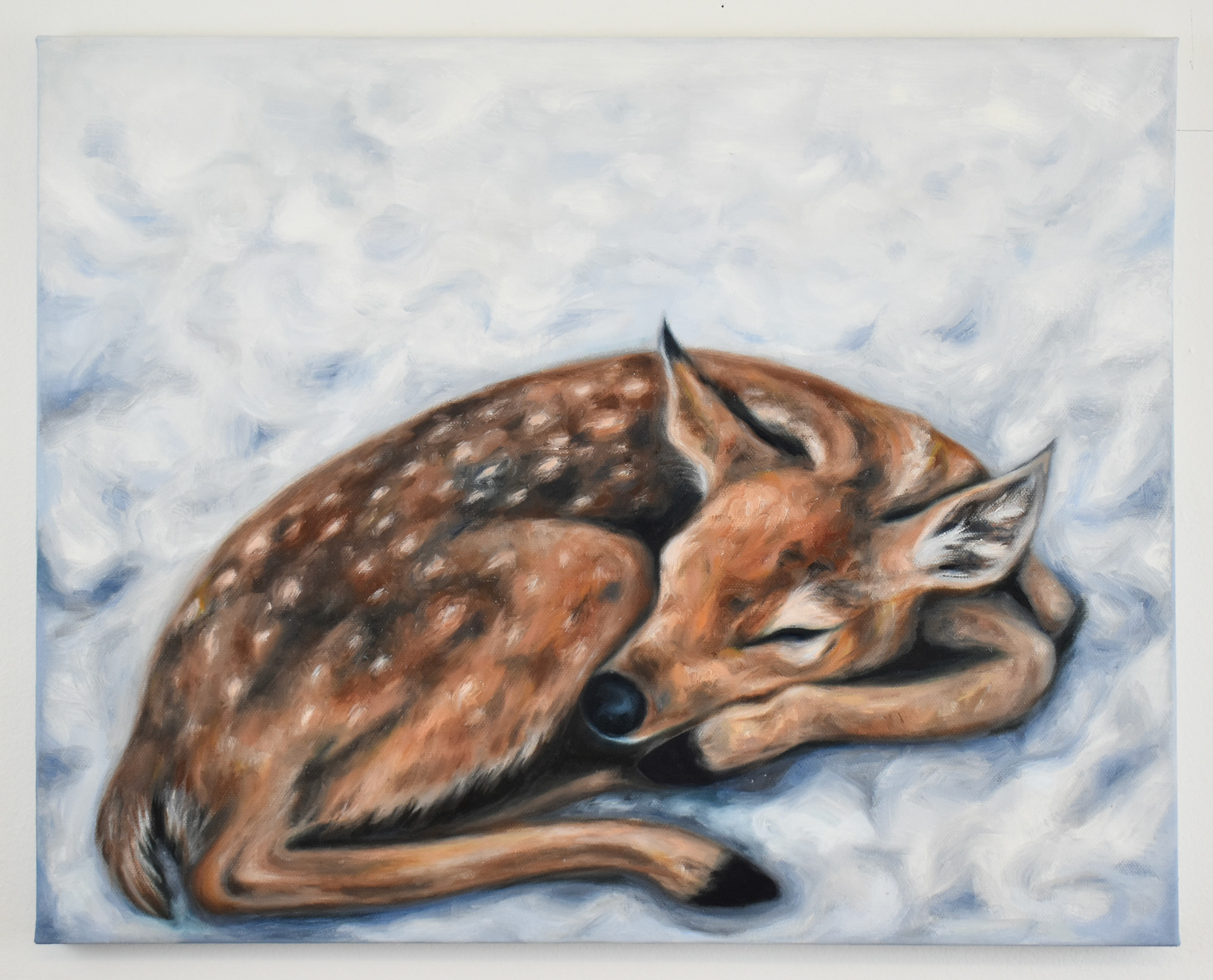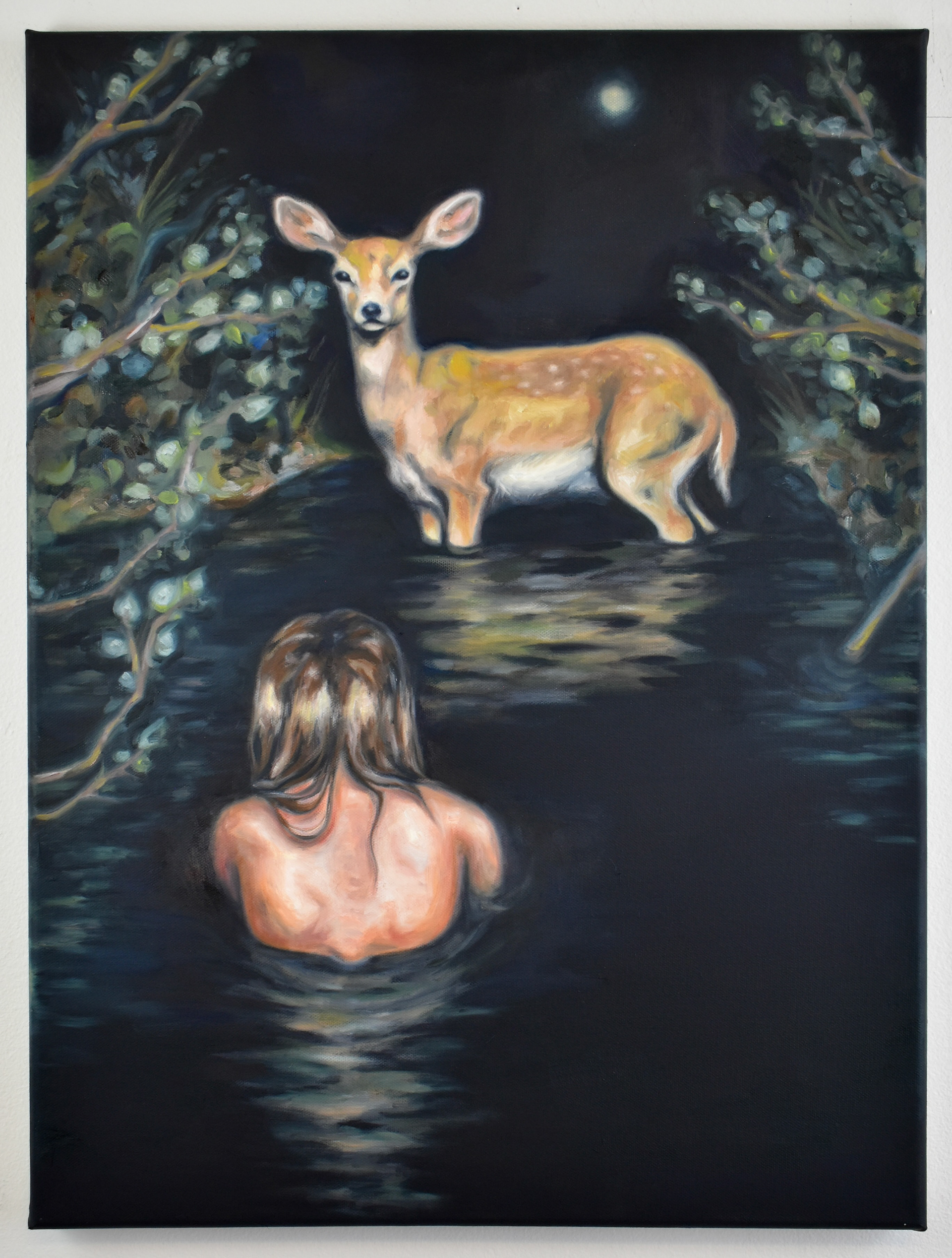 My work explores the strength and beauty of feminine connection; between women, in nature, and through shared emotional experience. Central to this exploration is the recurring image of the deer, particularly the doe, which serves as a symbol of the feminine spirit. Often seen as gentle or vulnerable, the doe also embodies resilience, protectiveness, and deep intuition. I see in her a reflection of the quiet power found in feminine relationships: graceful, nurturing, and fiercely connected. These animals move with awareness and rely on one another for safety and support, much like the emotional networks that exist between women. In my paintings, the deer becomes a metaphor for this strength in community and care. Using traditional oil painting techniques, I blend personal symbolism with classical methods to reclaim and reinterpret traditional narratives. My work invites reflection on how we see femininity; not as weakness, but as a source of enduring connection and power.